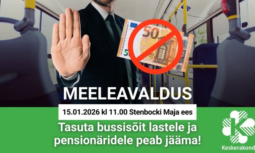 Eesti Keskerakond korraldab täna kl 11 Stenbocki maja ees meeleavalduse Vabariigi Valitsuse plaani vastu hakata maakonna bussiliinidel küsima piletiraha nii laste kui ka pensionäride käest. Reformierakonna valitsus on kehtestanud automaksu ja tegutseb nüüd selle nimel, et muuta ühistranspordi kasutamine veelgi kallimaks.